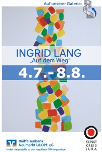 Wir laden Sie zur Eröffnungsveranstaltung anlässlich der Einzelausstellung von Ingrid Lang (04.07.2025 - 08.08.2025) am Freitag, den 04.07.2025 um 15:30 Uhr, in die Hauptstelle der Raiffeisenbank Neumarkt i.d.OPf. eG, Untere Marktstraße 11, herzlich ein.