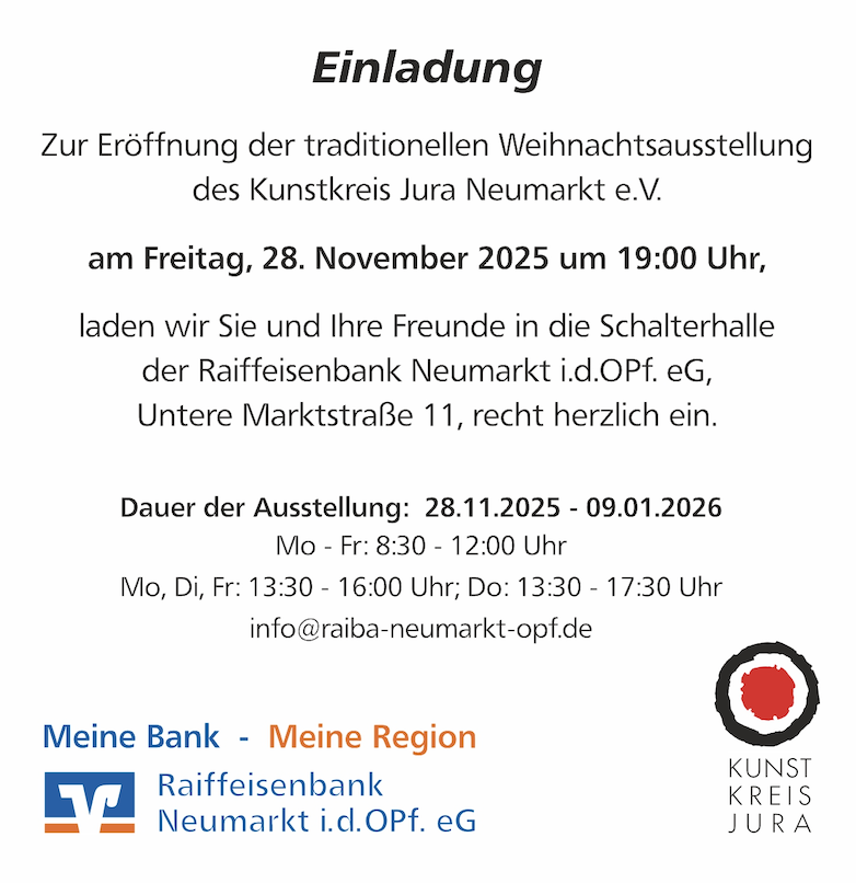 Der Kunstkreis Jura Neumarkt e.V. lädt Kunstliebhaber und Interessierte herzlich zur feierlichen Eröffnung seiner traditionellen Weihnachtsausstellung ein. Die Veranstaltung findet am Freitag, den 28. November 2025, um 19:00 Uhr in der Schalterhalle der Raiffeisenbank Neumarkt i.d.OPf. eG in der Unteren Marktstraße 11 statt.
