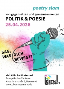 Unter dem Motto "Von Gegensätzen und Gemeinsamkeiten: Politik & Poesie" lädt das OBTM Neumarkt (Oberpfälzer Bündnis für Toleranz und Menschenrechte) zusammen mit Kooperationspartnern erneut zu einem besonderen Poetry Slam ein.