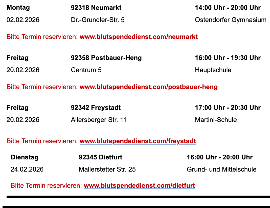 Im Landkreis Neumarkt besteht zudem weiterhin die Möglichkeit, sich im Alter zwischen 18 und 45 Jahren bei allen Terminen des Blutspendedienstes als Stammzellspender registrieren zu lassen. Jede Registrierung und jede Blutspende kann im Ernstfall ein Menschenleben retten.
