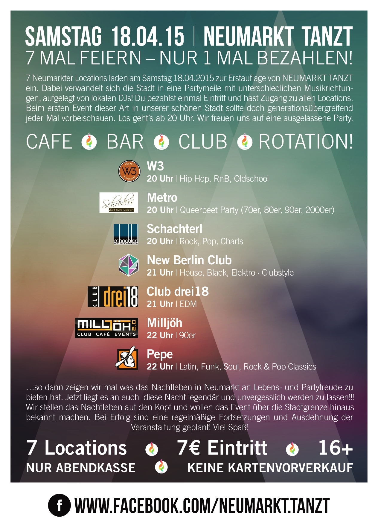 Mit NEUMARKT TANZT setzen sich 6 Gastronomen mit einem abwechslungsreichen Programm das Ziel die Aufmerksamkeit der Öffentlichkeit auf das Neumarkter Nachtleben zu erhöhen und dessen Integration in das kulturelle Leben der Stadt zu fördern! Hierbei liegt es vor allem im Interesse der Wirte, neben dem „Stadtpublikum“ auch das „Landkreispublikum“ in die Stadt zu locken und an den legendären Partys, die hier regelmäßig stattfinden, teilhaben zu lassen. Gemeinsam wurde ein facettenreiches Veranstaltungskonzept erarbeitet um das Neumarkter Nachtleben einer breiten Öffentlichkeit zugänglich zu machen.