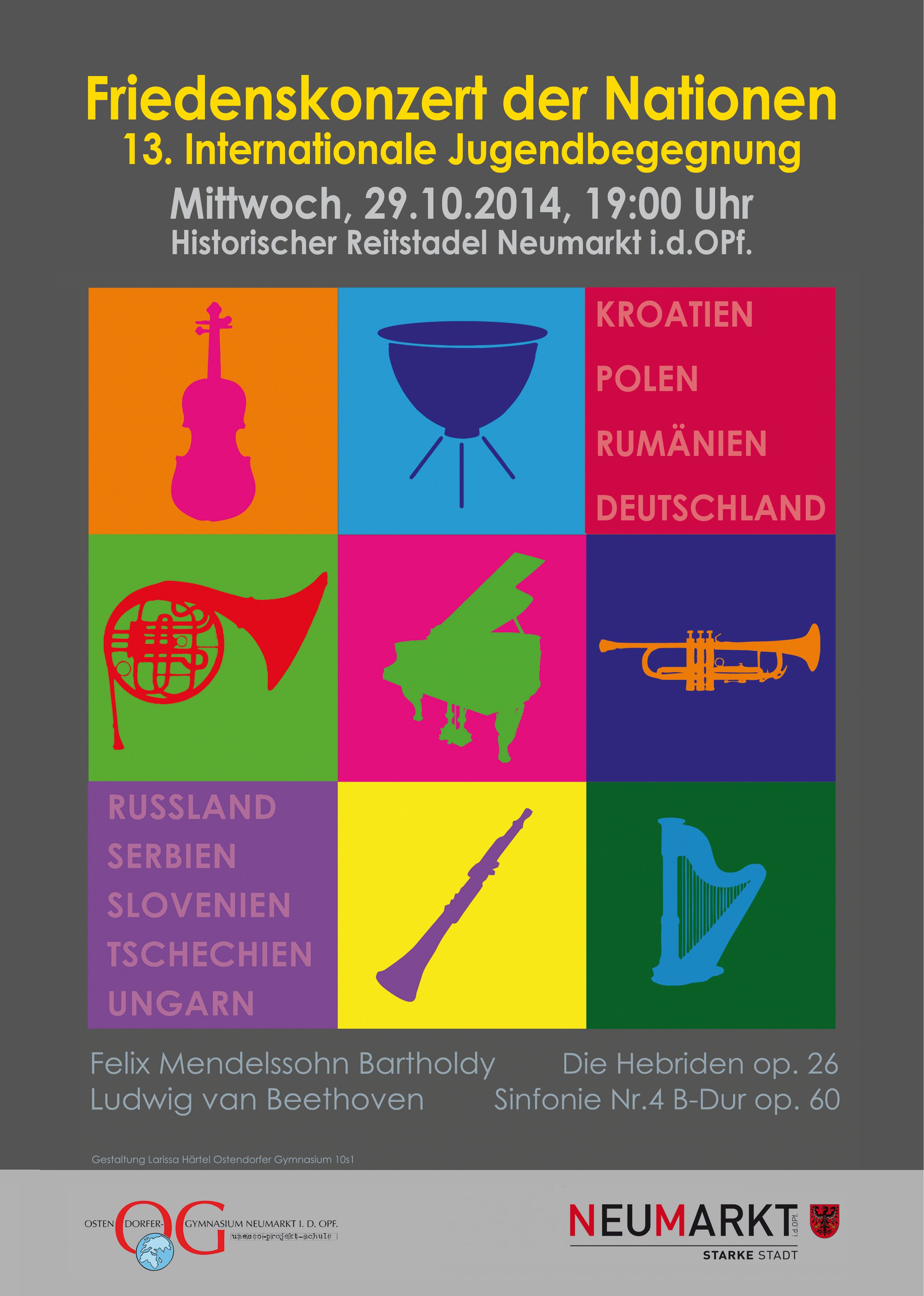 Die „Internationale Jugendbegegnung“ findet heuer bereits zum 13. Mal statt. Vom 22. bis 30. Oktober treffen sich Jugendliche aus neun Ländern in Neumarkt, wobei neben den Gastgebern Jugendliche aus Kroatien, Polen, Rumänien, Russland, Serbien, Slowenien, Tschechien und Ungarn beteiligt sind. Wesentliches und verbindendes Element der Internationalen Jugendbegegnung ist die Musik. Denn neben einem Begleitprogramm, das u.a. einen Empfang durch Oberbürgermeister Thomas Thumann, einen Stadtrundgang, Ausflüge nach Nürnberg und Regensburg und vieles mehr umfasst, proben die Jugendlichen täglich gemeinsam für das Friedenskonzert der Nationen, das am Mittwoch, 29. Oktober im Neumarkter Reitstadel aufgeführt wird. Dieses Konzert bildet den Höhepunkt der einwöchigen Jugendbegegnung und unterstreicht die universell verständliche Sprache der Musik.